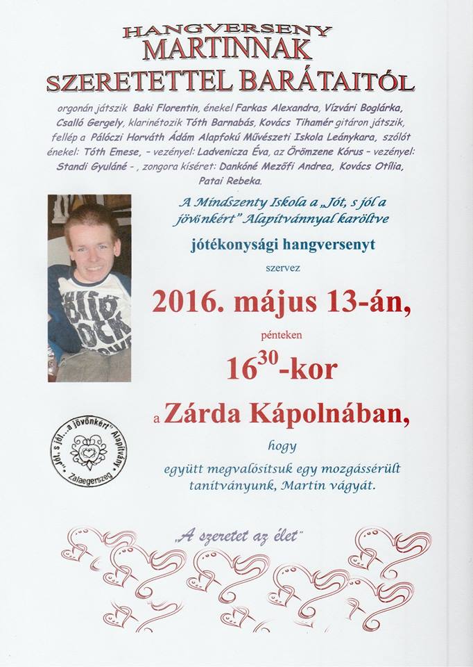 KezdőlapAjánlóHangverseny egy mozgássérült kisfiúért - 2016.05.13, 16.30 órától << Vissza Hangverseny egy mozgássérült kisfiúért – 2016.05.13, 16.30 órától Időpont: 2016. május 13. péntek