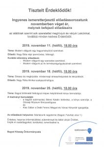 KezdőlapBagodHírlevélIsmeretterjesztő előadások - november << Vissza Ismeretterjesztő előadások – november 2019. október 31.